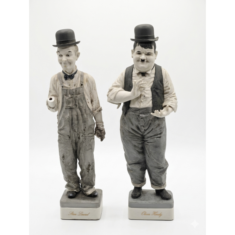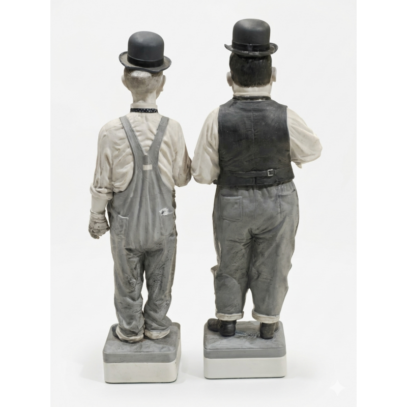 ESTADO: MAL ESTADO DE CONSERVACIÓN. OLIVER HARDY ESTÁ EN UN ESTADO MEDIO DE CONSERVACIÓN, STAN LAUREL ESTÁ EN MAL ESTADO, LE FALTA UNA MANO Y LA CABEZA ESTÁ ROTA.