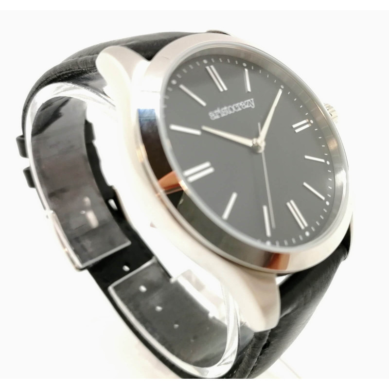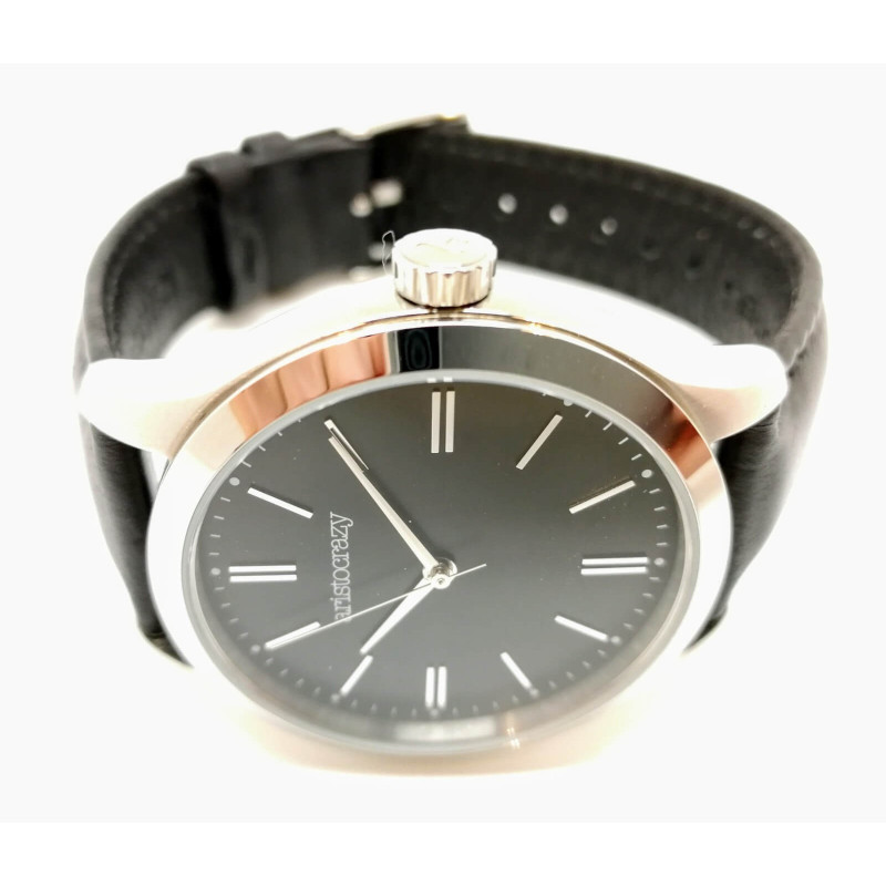 Reloj Mitte con caja de 36 mm de acero 316L, bisel plano y esfera color negro soleil. Correa de piel negra con cierre con hebilla. Movimiento japonés de cuarzo con resistencia al agua de 5 ATM.