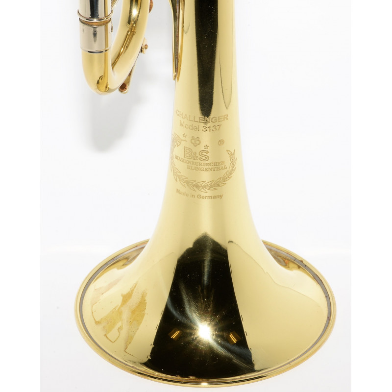 Todas las trompetas profesionales B&S Challenger están equipadas con pistones de monel, campana de una pieza martilleada a mano, tudel de bronce, juntas de niquel, anillas de afinación, retenedor en la tercera bomba, y desagües en la curva principal y tercera bomba.