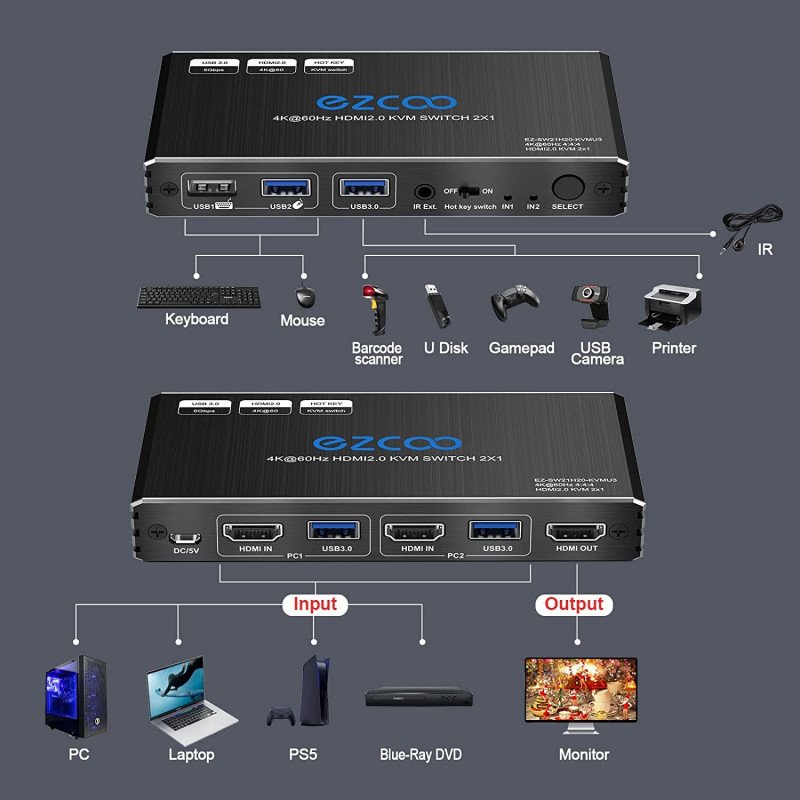 KVM 400 18 Gbps ancho de banda HDCP 2.2, altamente compatible con todos los sistemas operativos como Windows, Mac OS, Linux. Funciona perfectamente con Xbox one X, PS4 Pro, 4K, Roku 4, Amazon Fire TV, reproductor de Blu-ray, etc.