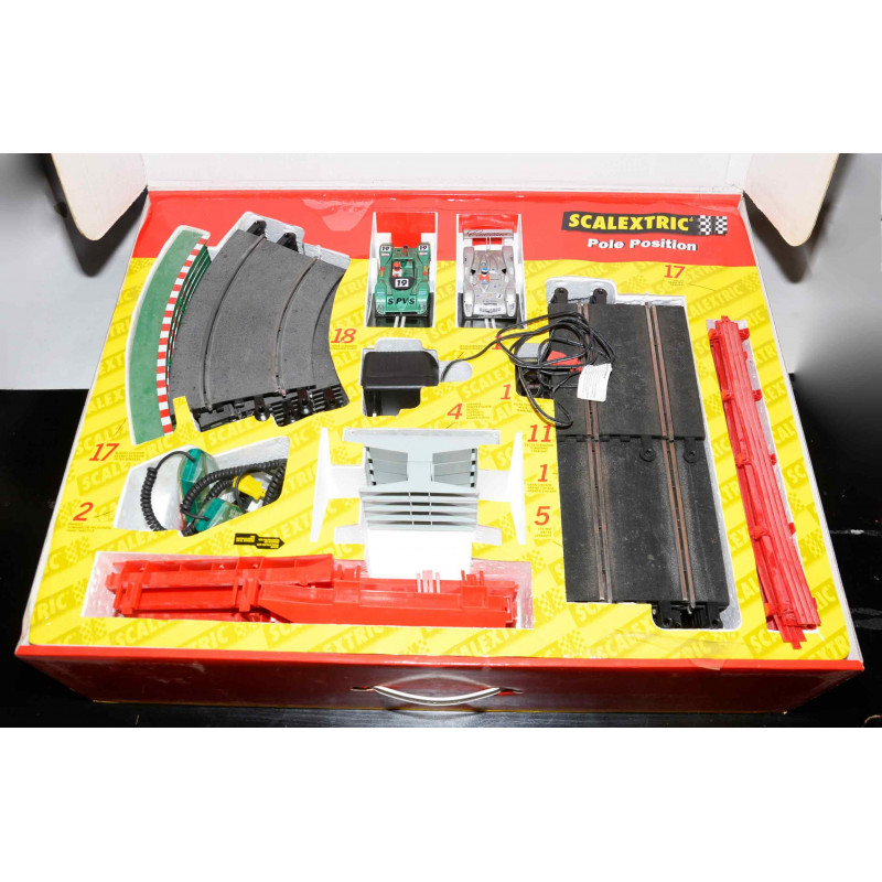 INCLUYE: CAJA Y CORCHO, MANDOS Y COCHES, PISTAS Y PIT BOX