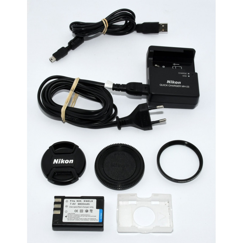 INCLUYE: CARGADOR, CORREA, 1 BATERÍA ORIGINAL, 1 BATERÍA COMPATIBLE, TAPA FRONTAL DE OBJETIVO Y DEL CUERPO (ORIGINALES)