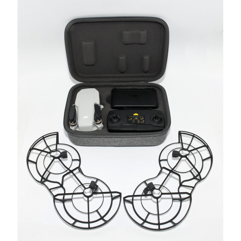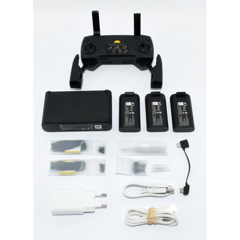 INCLUYE: ESTUCHE RÍGIDO, HÉLICES-JOYSTICKS-TORNILLOS-DESTORNILLADOR DE REPUESTO (A ESTRENAR), PROTECTOR DE HÉLICES, CABLE USB-C, CARGADOR (A ESTRENAR), BASE DE CARGA, 3 BATERÍAS ORIGINALES Y MANDO