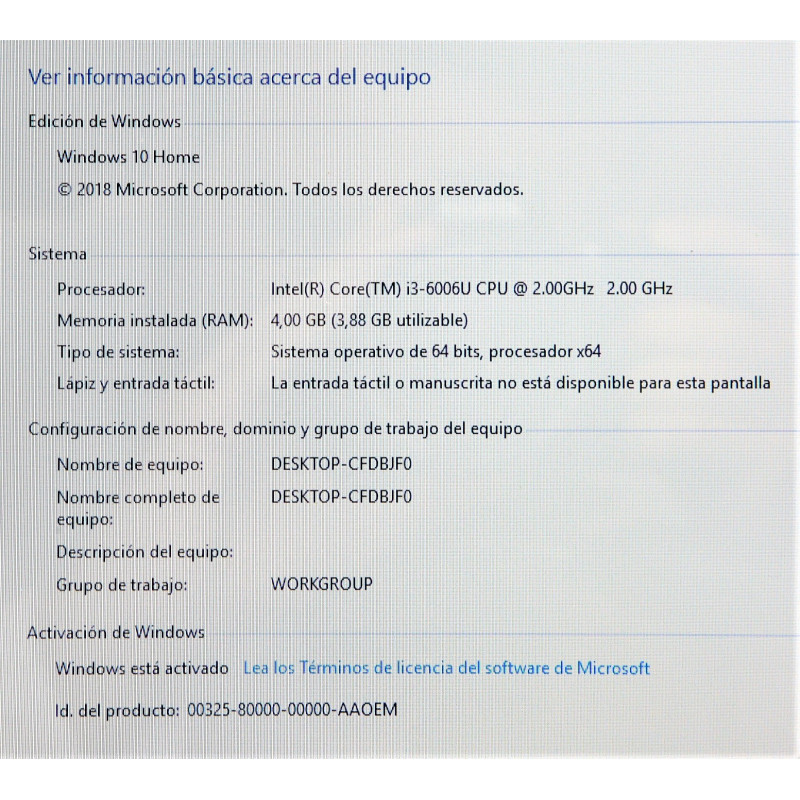 - Intel Core I3-6006U 2.00GHZ
