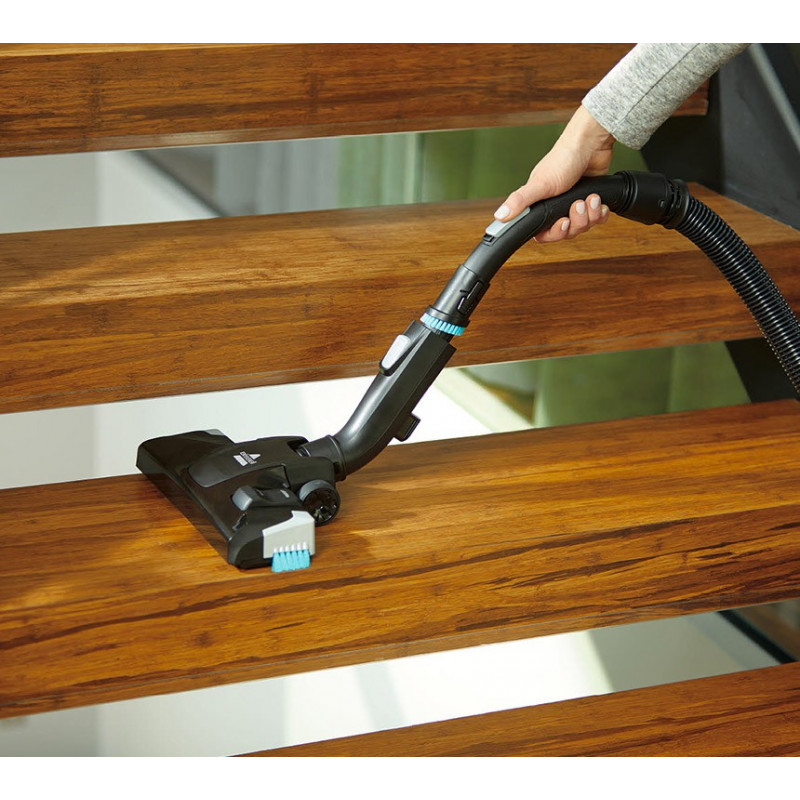 Cabezal multisuperficie con cerdas de limpieza en los bordes que permiten aspirar la suciedad de rodapies y esquinas.