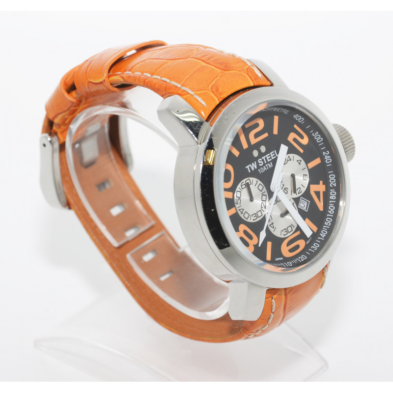 Reloj de caballero con caja de acero y detalles y correa de cuero color naranja.