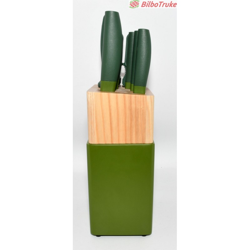 SET DE 5 CUCHILLOS, AFILADOR, TIJERA Y TACO DE MADERA