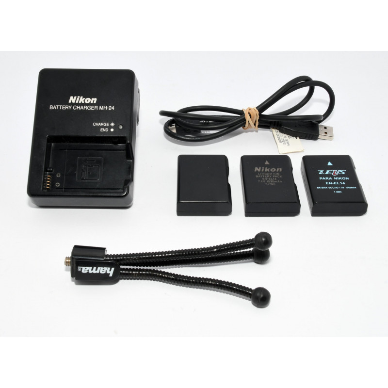 INCLUYE: CARGADOR, TAPA FRONTAL, FILTRO ZEUS, 1 BATERIA ORIGINAL, 2 BATERIAS COMPATIBLES Y MINI TRIPODE