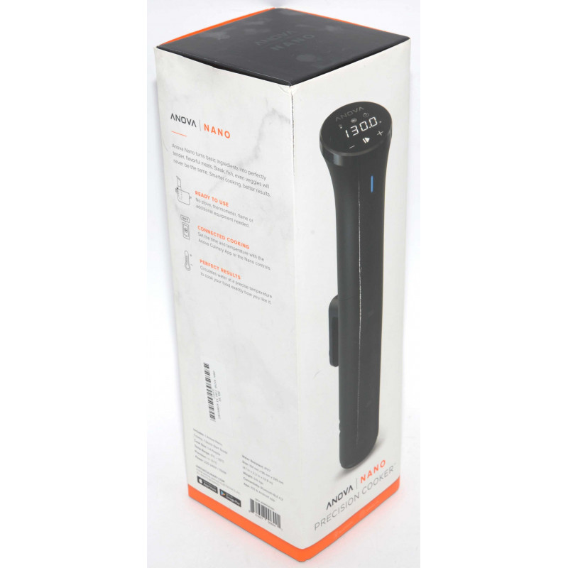 La anova Nano facilita la obtención de resultados de cocción al vacío de calidad restaurante en casa. Nano se conecta a su teléfono con Bluetooth para que pueda de preparar las comidas extraordinarios con sólo pulsar un botón y seguimiento de los progresos realizados desde otra habitación
