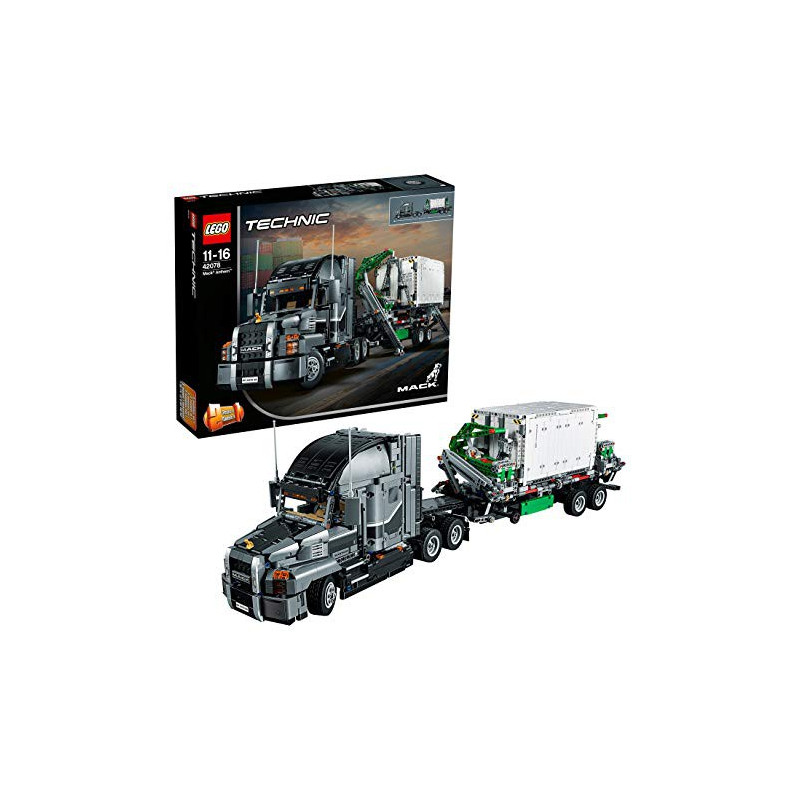 Explora el diseño y la ingeniería más modernos con esta réplica LEGO® Technic del camión con remolque Mack Anthem. Desarrollado en colaboración con Mack® Trucks Inc., el modelo incorpora numerosos detalles técnicos y funciones de gran realismo, como dirección en el eje delantero, tracción trasera y un motor de 6 cilindros en línea con pistones móviles y un ventilador que gira de verdad. El remolque desmontable cuenta con estabilizadores extensibles, patas de apoyo que funcionan de verdad, brazos de grúa sincronizados capaces de levantar cargas laterales y un contenedor con puertas que se pueden cerrar; la cabina del conductor, a la que se puede acceder, está equipada con puertas que se abren, asientos ajustables, un detallado salpicadero, volante, viseras solares y una cama. Este avanzado set de construcción “2 en 1” incluye también un adorno Mack para el capó con forma de bulldog y se puede convertir en una detallada réplica del emblemático camión de la basura Mack LR.